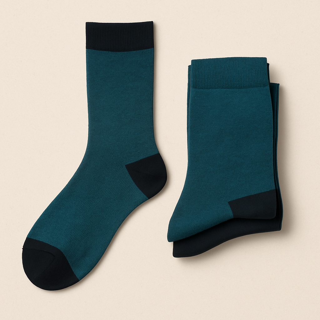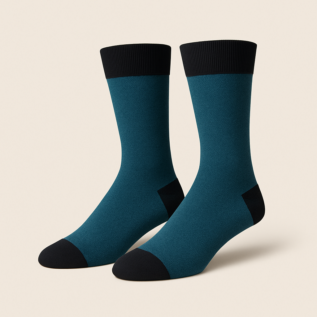 Stylish teal blue socks contrasted with black heel and toe accents for a refined look.
