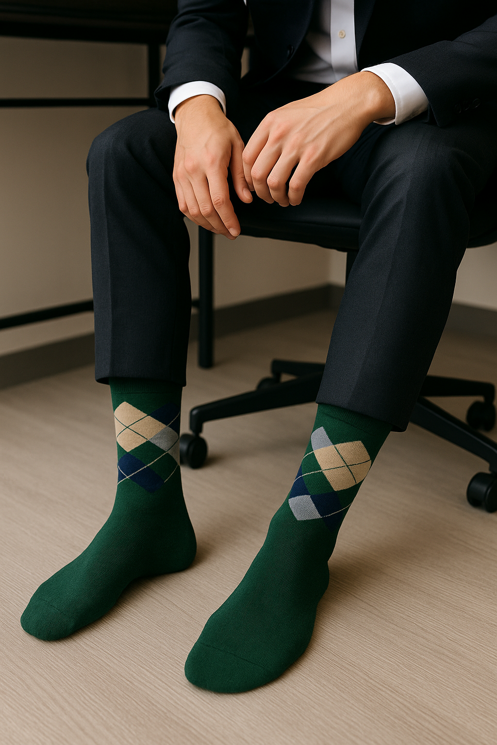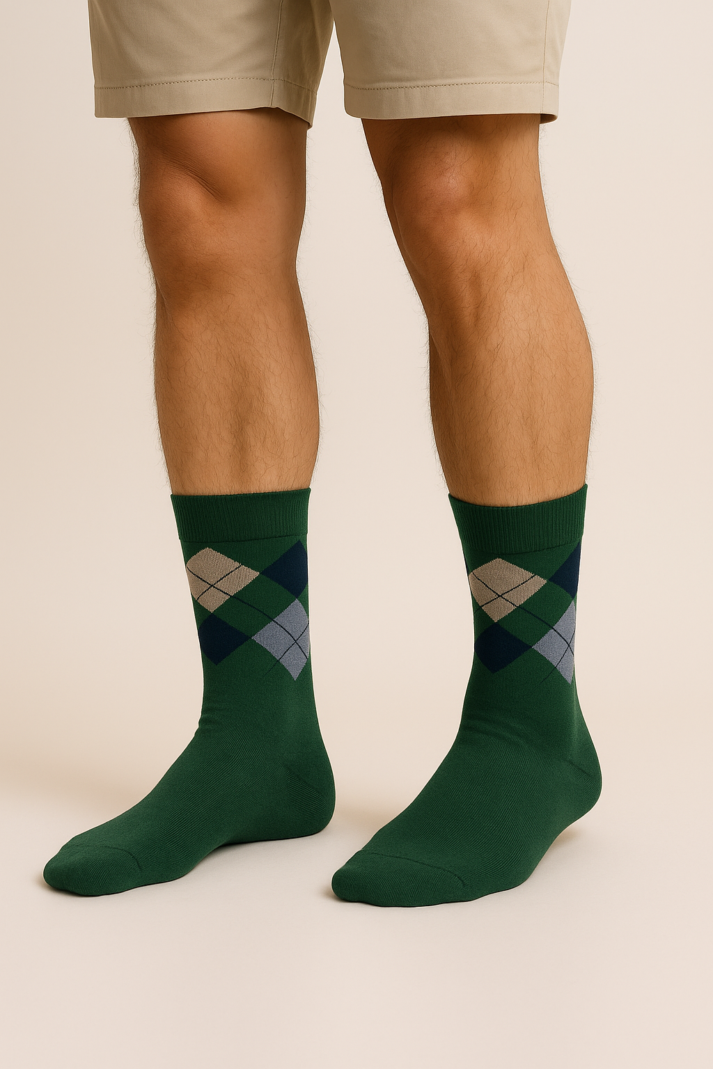 Distinguished by deep emerald green with a refined argyle pattern of navy, grey, beige, and sky blue — sophistication redefined.