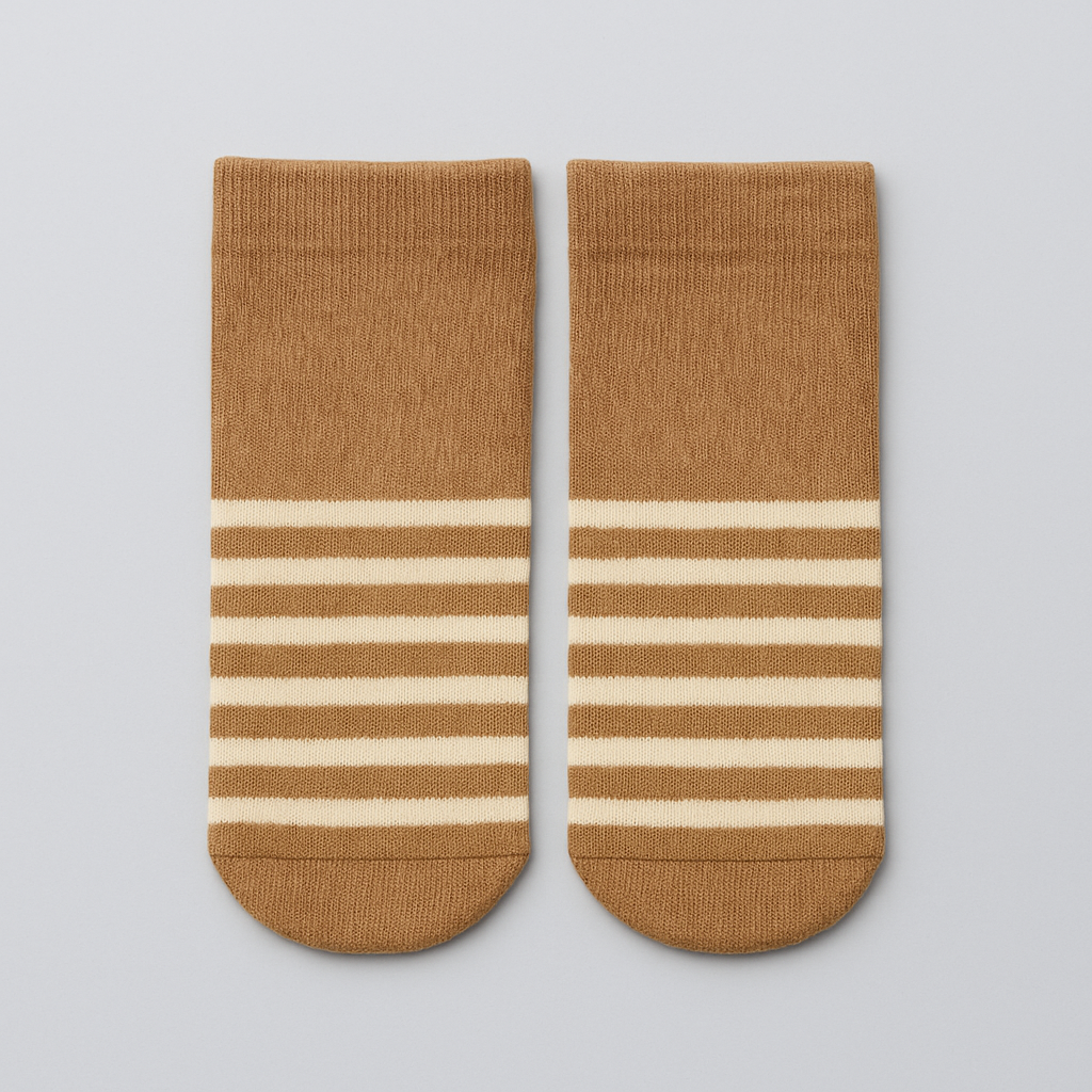 Cozy brown infant socks featuring cream-colored stripes for a cute design.