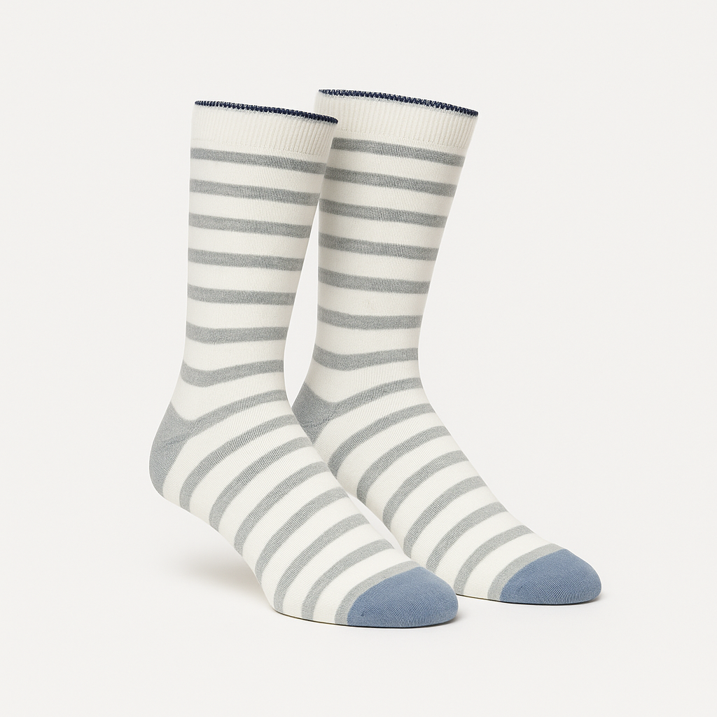 White & Grey Striped Sock with Blue Toe & Grey Heel