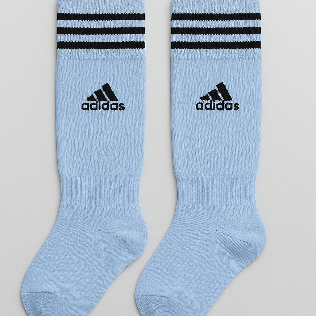 Stylish light blue Adidas soccer socks built for performance and comfort.