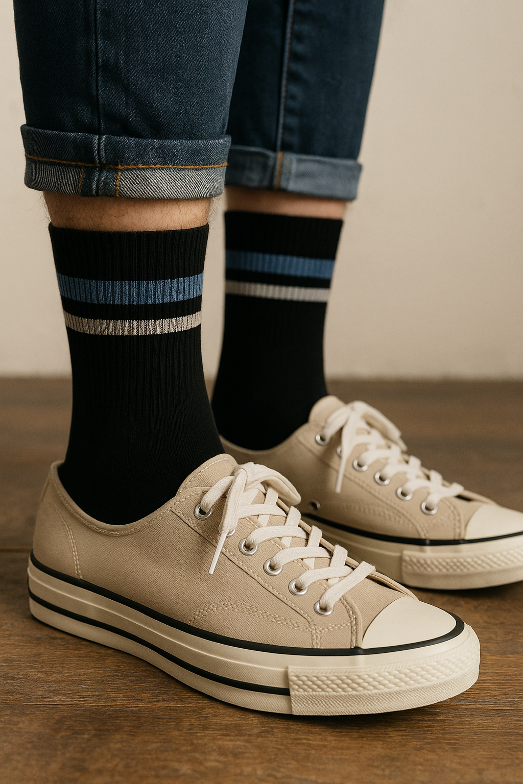 Sleek black socks accented with bold blue and white double stripes for a fresh sporty look.
