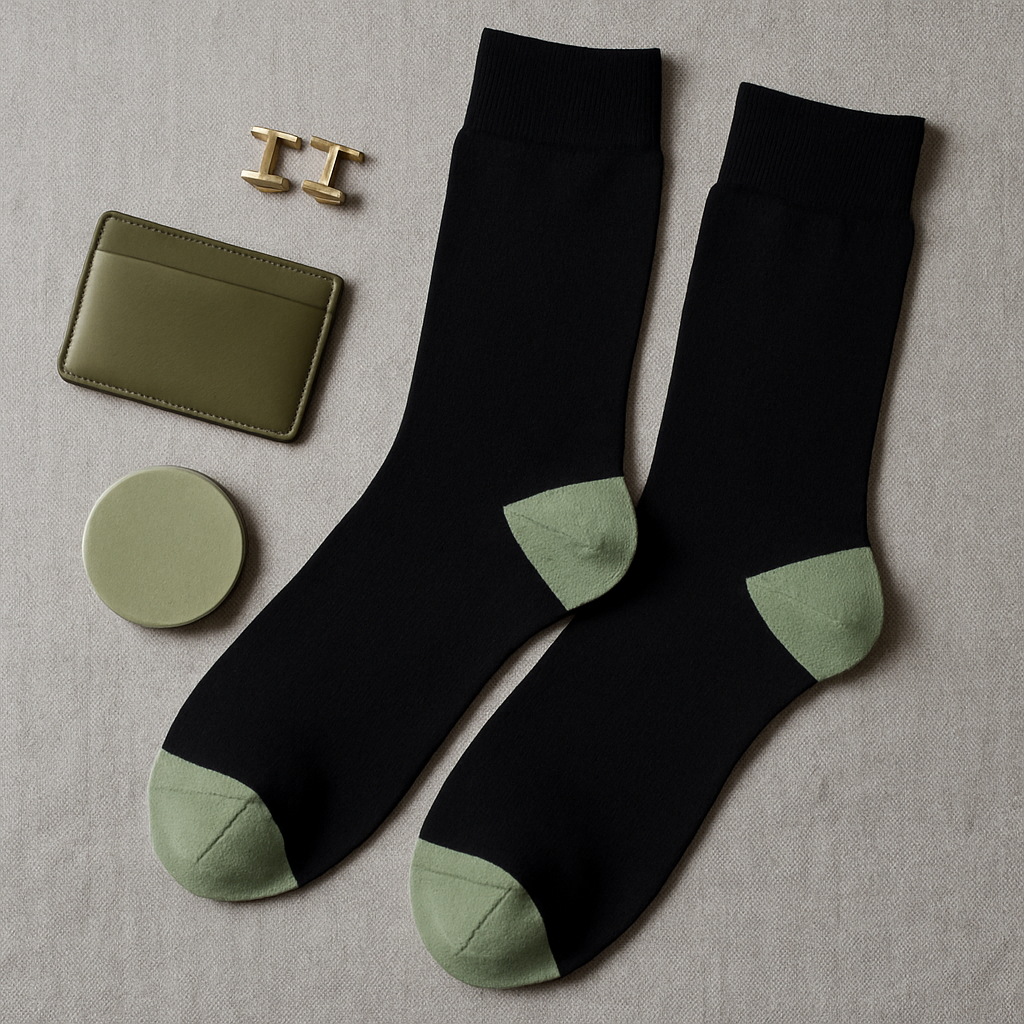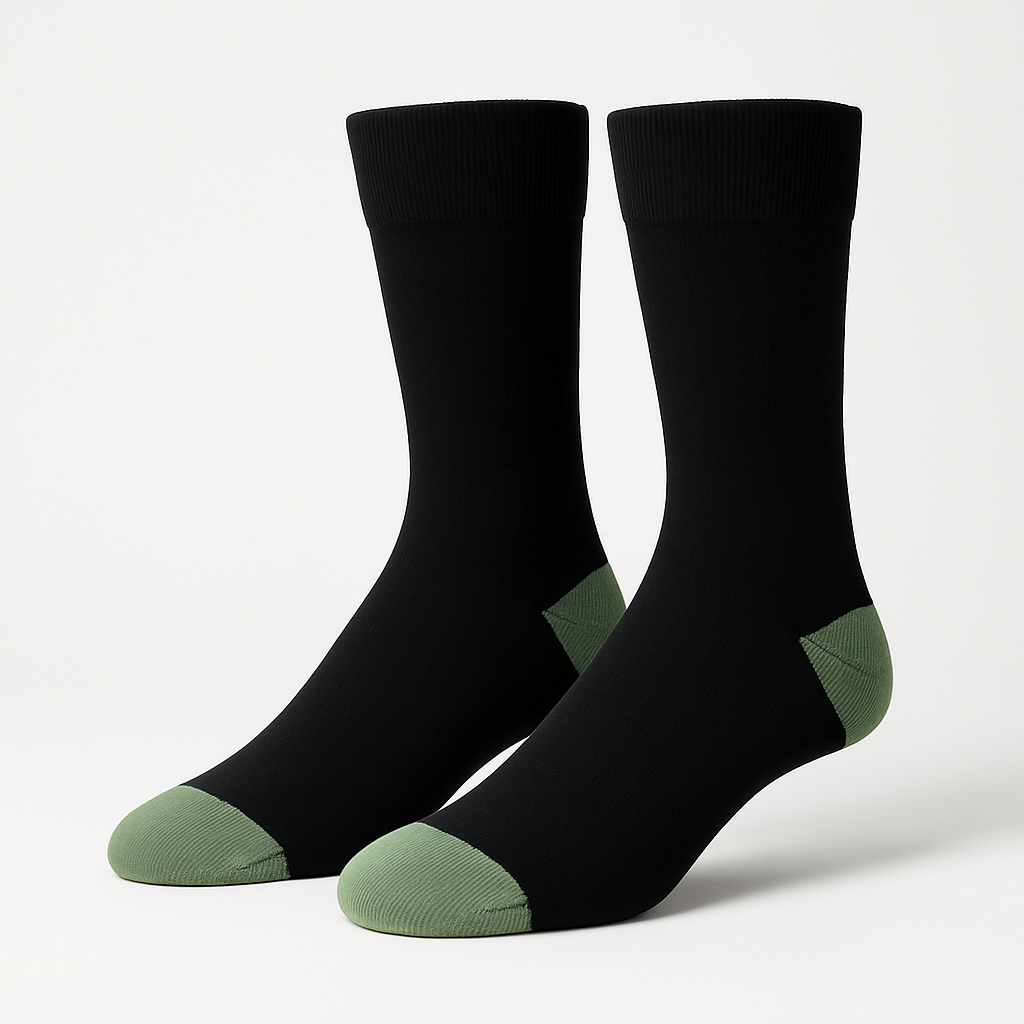 Deep black socks lifted by calm sage-green heels and toes for a refined contrast.