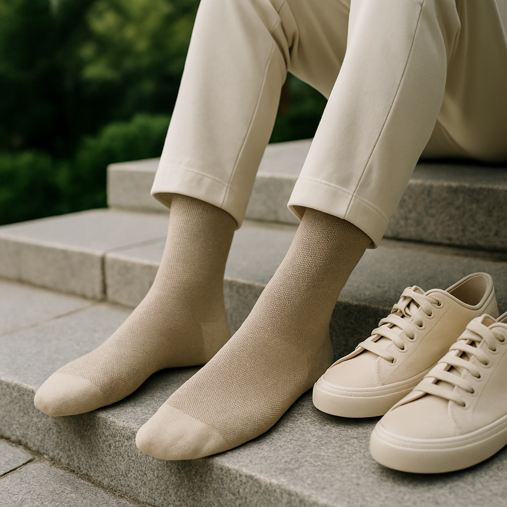 Reinforced cuff, heel, and toe in a soft sand shade for lasting durability.