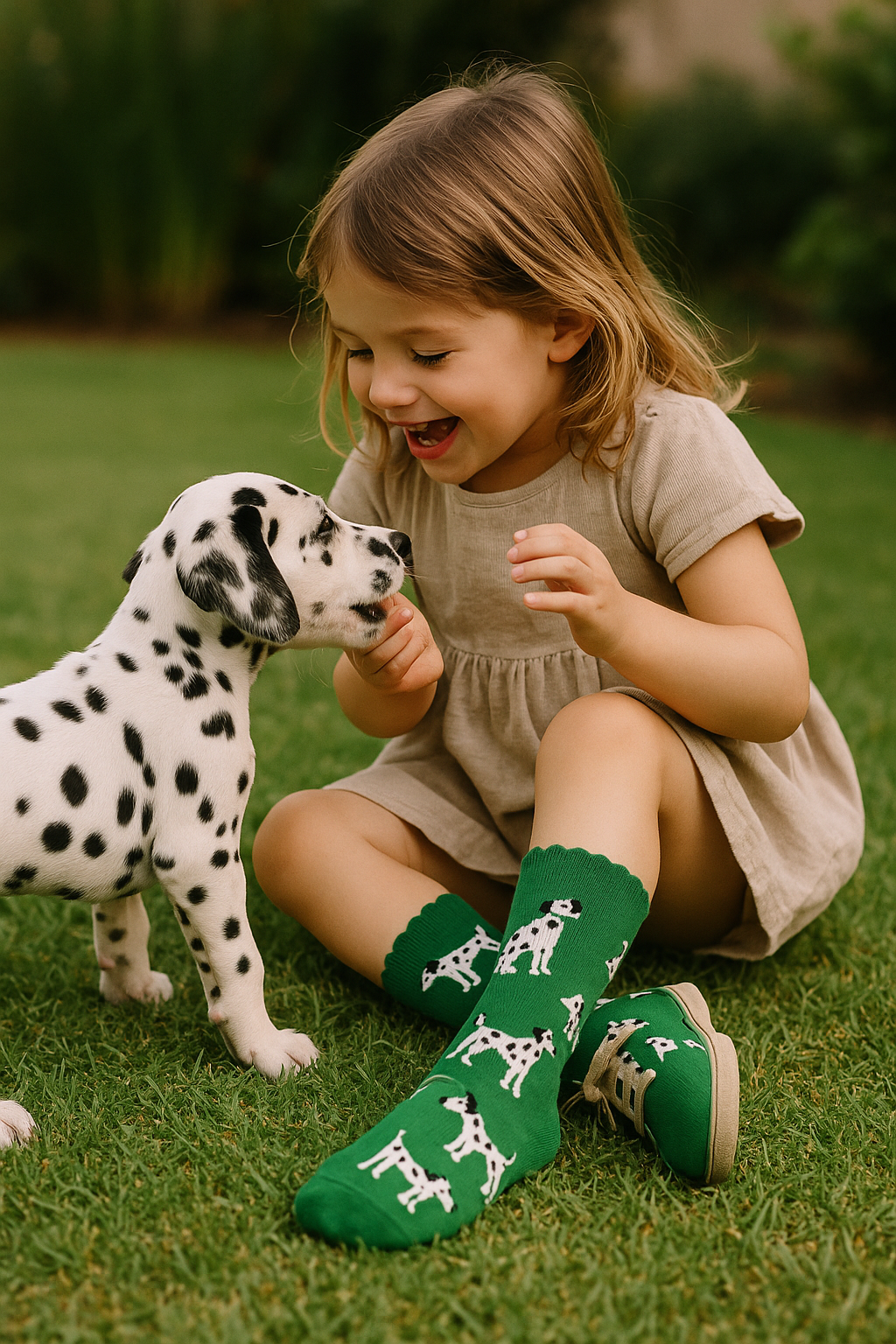 Add playful charm to your style with these green socks featuring cute Dalmatian dog patterns.