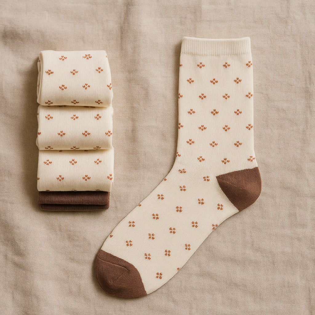 Soft ivory socks adorned with tiny cherry-blossom style motifs for a delicate look.
